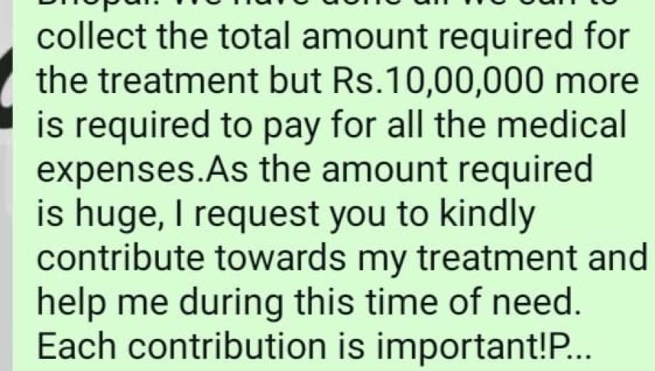 Hi,My name is Neeraj Manohar and I am raising funds for my medical expenses. I am undergoing treatment at Siddhanta Hospital, Bhopal. We have done all we can to collect the total amount required for the treatment but Rs.10,00,000 more is required to pay for all the medical expenses.As the amount required is huge, I request you to kindly contribute towards my treatment and help me during this time of need. Each contribution is important!P...